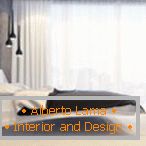 Več kot le skromne dimenzije spalnice so oblikovalcem prihranile, da izberejo slog za njegovo zasnovo. Minimalistična notranjost, popolnoma uravnotežen in brezhibno izveden, omogoča strankam, da se počutijo lastniki luksuznega penthousea in ne skromnega enosobnega apartmaja.