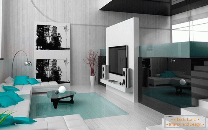 Presenetljivo harmonično in subtilno sestavljeno notranjo dnevno sobo. Dokončanje stropa, sten, tal, futuristične razsvetljave in pohištva je videti kot eno.